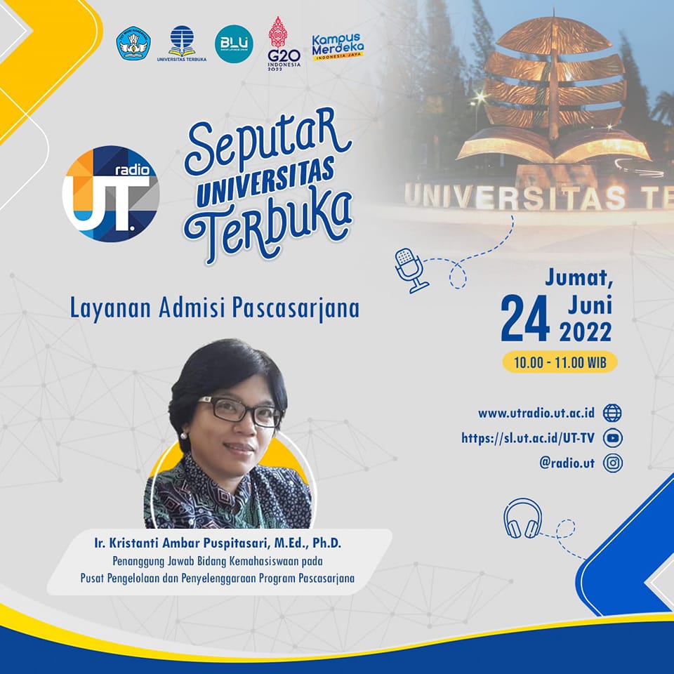 Juni 21, 2022Februari 10, 2026Agenda Tutorial Radio – Proses Pembelajaran di Pascasarjana Program : Seputar Universitas Terbuka Topik : Proses Pembelajaran di PPs Narasumber : Dr. Siti Julaeha, M.A. – Kepala Pusat Pengelolaan dan […] Baca selanjutnya
