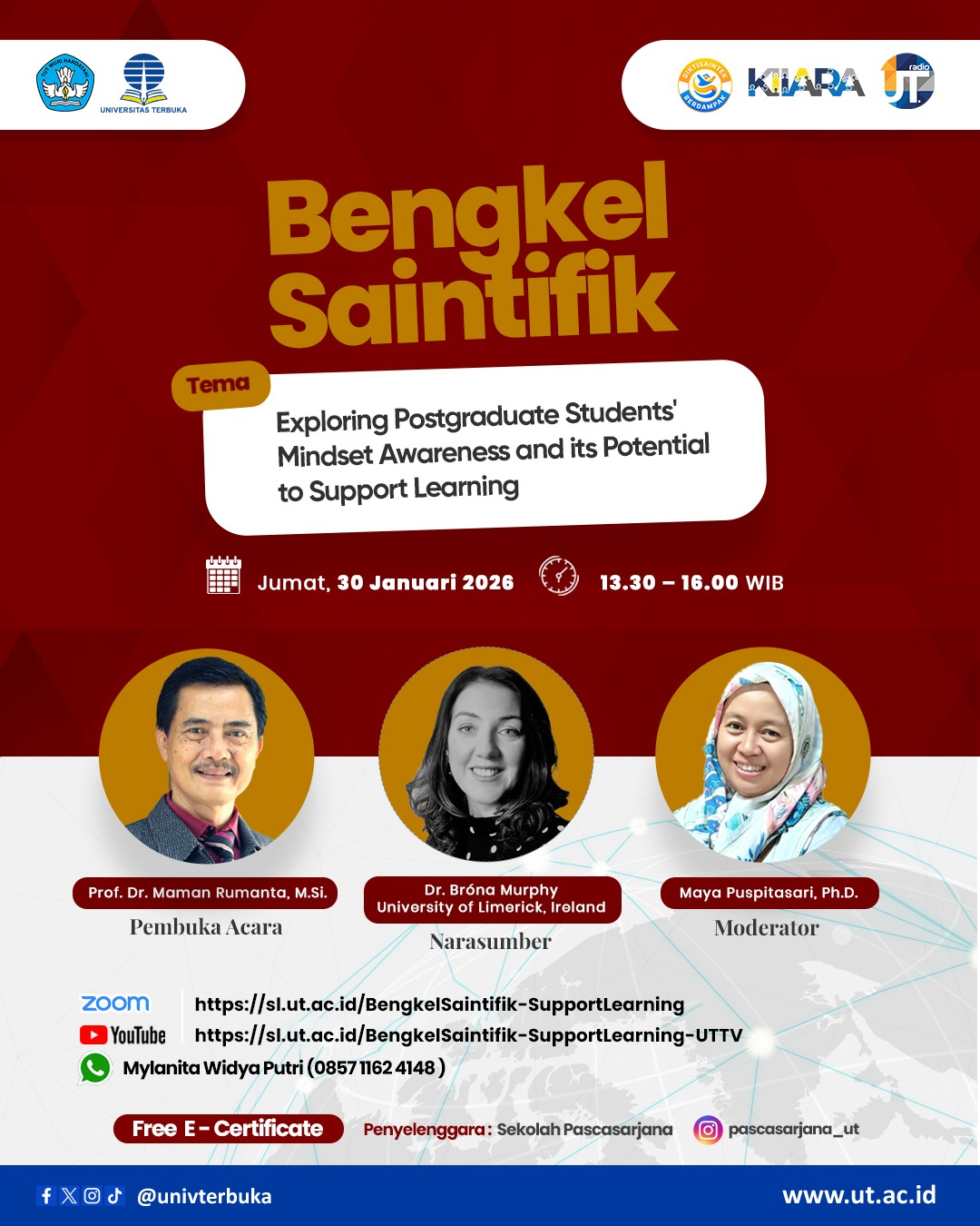 Sekolah Pascasarjana Universitas Terbuka mengundang Bapak/Ibu di kegiatan Webinar Bengkel Saintifik dengan materi: “Exploring Postgraduate Students’ Mindset Awareness and its Potential to Support Learning”